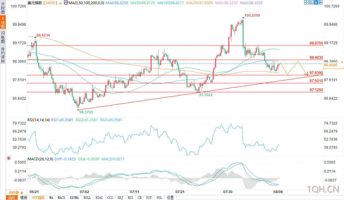 若果断跌破该水平,可能打开通往97.50和97.12的路径。除非指数持续收于98.48上方,否则上行空间有限,届时焦点将转向99.07。,