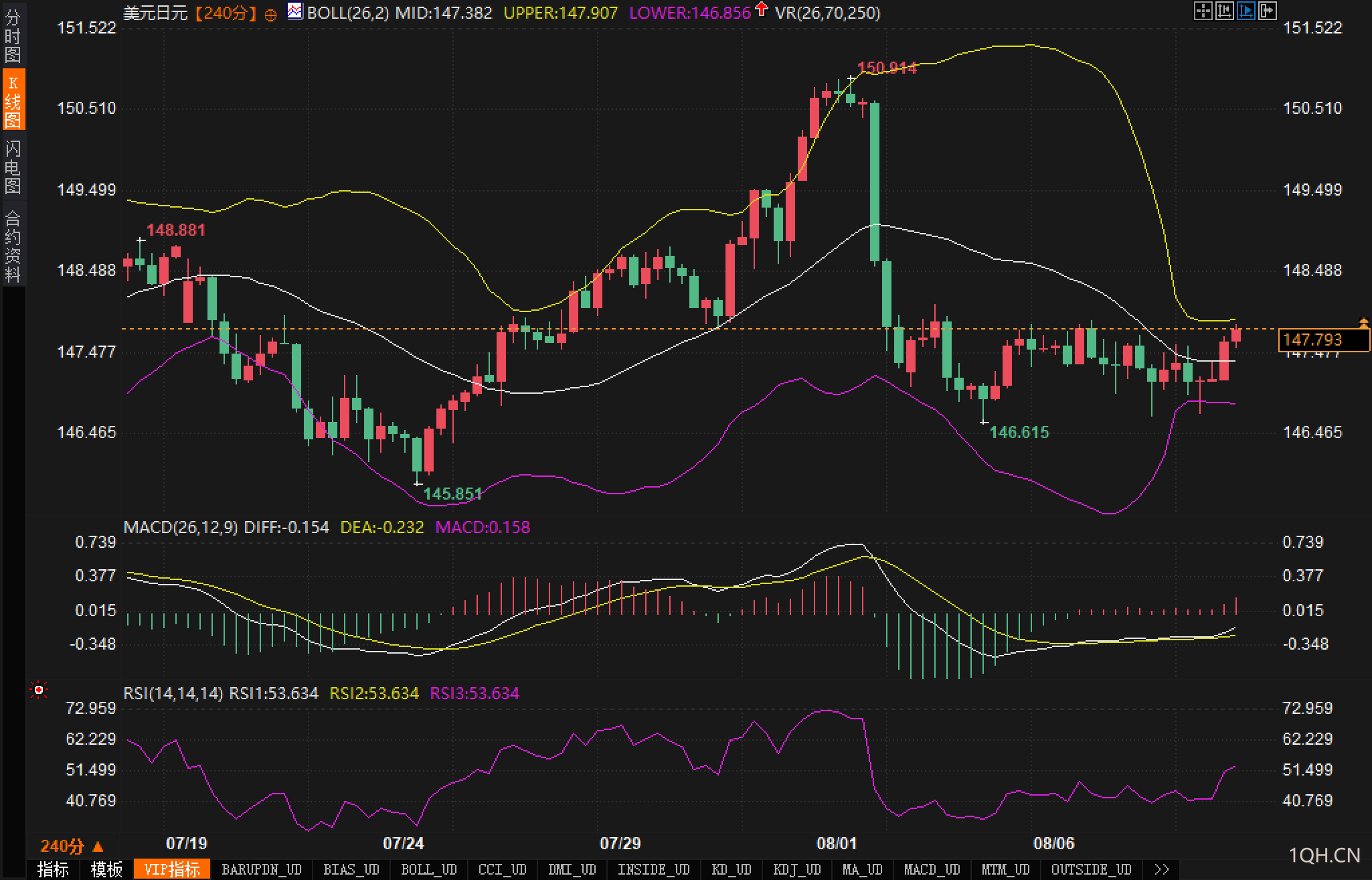 240分钟K线显示,布林带中轨位于147.382,上轨147.907,下轨146.856,最新价报147.793,运行于中轨上方。过去两周结构先扬后挫:7月末至8月初上冲后见阶段高点150.914,随后快速回撤至146.615,现阶段围绕147.5—148.0窄幅震荡,布林带带宽较峰值明显收窄,呈“布林带挤压”特征,指向方向选择临近。