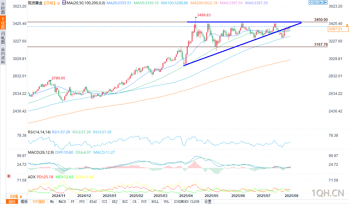支撑黄金的因素包括:对美国关税经济影响的担忧、持续的通胀压力,以及市场对美联储9月降息的预期升温。然而,美元小幅反弹、美债收益率相对稳定,以及全球股市普遍的风险偏好情绪,限制了金价进一步上涨,多头难以突破3400美元这一关键心理关口。