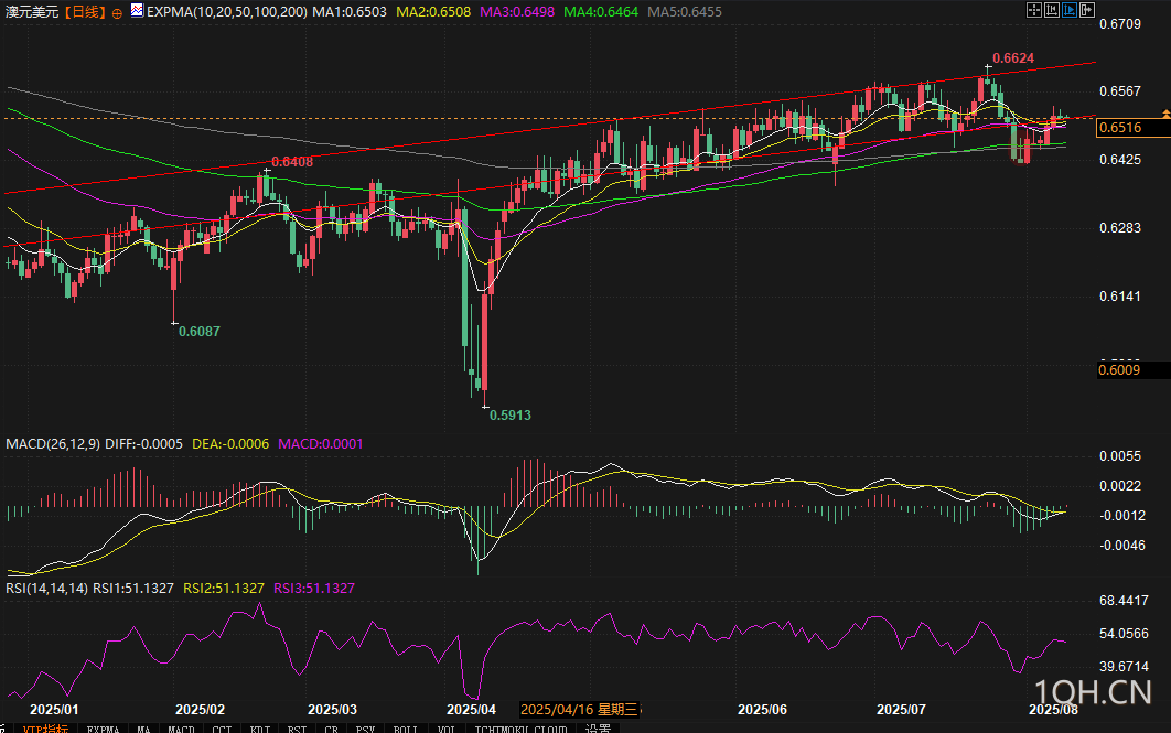 技术方面,澳元兑美元重新运行至上升通道内,受到10、20、50日EMA支撑,RSI在多头区域,MACD准备金叉回到零轴之上,暗示整体价格继续向上发展。
