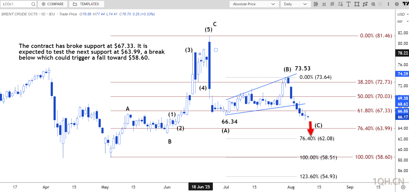 阻力位在66.91美元,突破该位可能推动价格上涨至67.78美元至69.20美元区间。日线图显示,该合约已突破67.33美元的支撑位。预计该合约将测试下一个支撑位63.99美元,跌破该支撑位可能引发跌向58.60美元的走势。