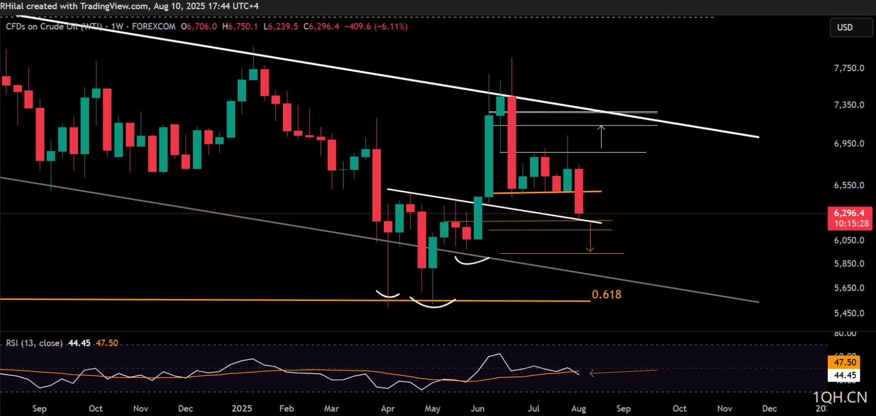 从周线来看,WTI最新一次下跌目前在5月至6月上涨趋势的0.618斐波那契回调位处企稳,恰好位于倒头肩形态的颈线,即约62.60水平。