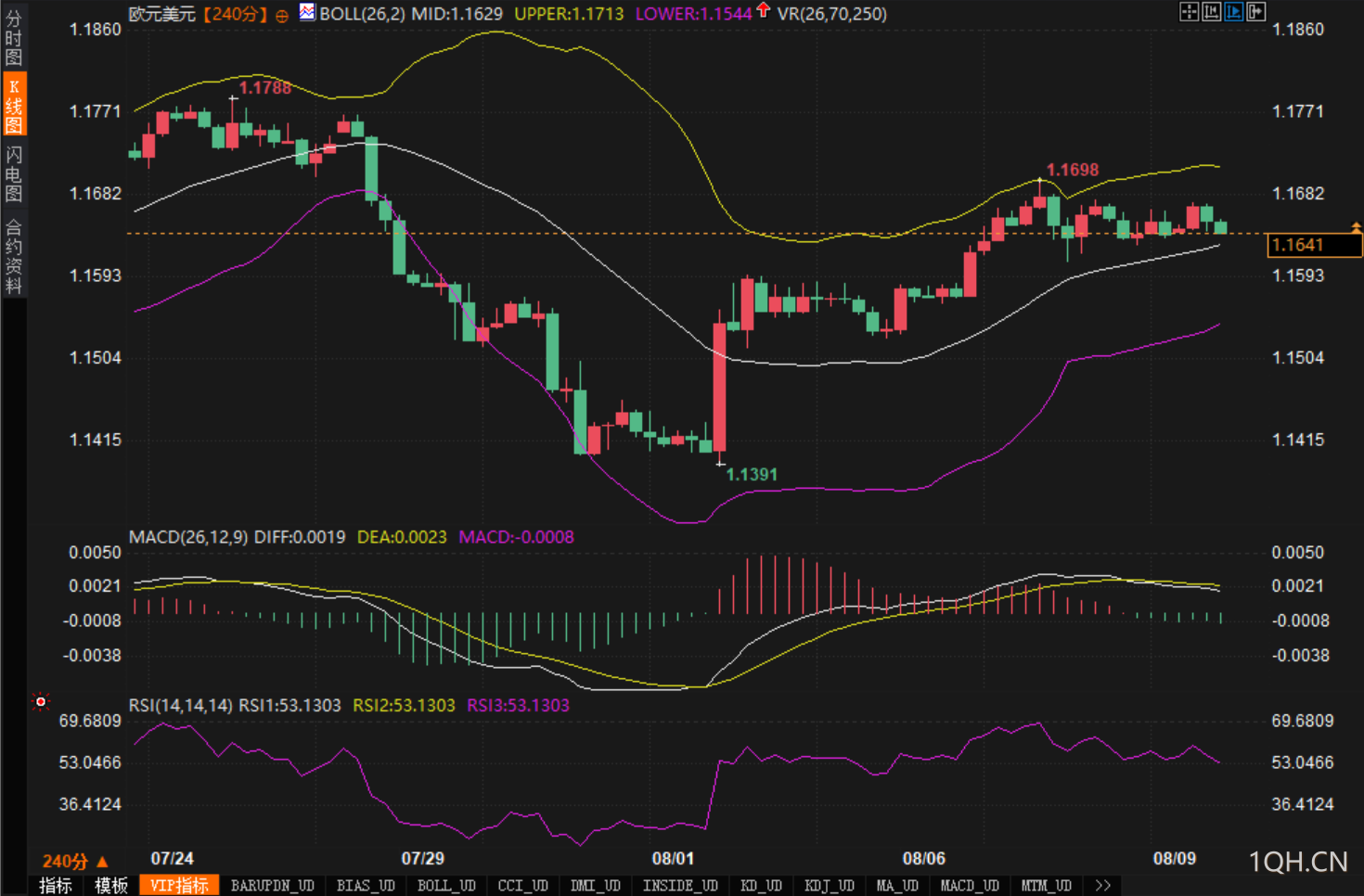 从240分钟技术图表分析来看,欧元兑美元汇价呈现出复杂的技术格局。汇价在1.1788高点之后经历了显著的下行调整,随后在1.1391附近形成重要的支撑底部。当前汇价运行在1.1640水平附近,位于布林带中轨区域附近,显示短期内处于相对均衡状态。