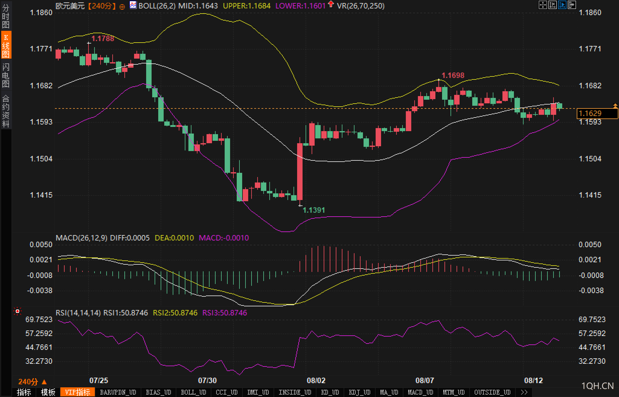 布林带分析: 从图表来看,布林带的压缩表明,市场的波动性相对较低,行情仍处于较为平稳的整理状态。如果汇价跌破下轨并未能出现有效反弹,则可能进一步考验更低的支撑水平,如1.1500。反之,若价格突破布林带的上轨,可能会迎来更强的反弹信号。