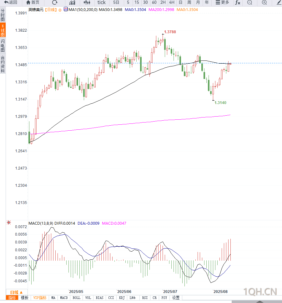 从日线图来看,英镑兑美元已突破短期下降趋势线,并稳守在1.3480上方。MACD指标持续放大红柱,RSI位于60上方,显示多头动能增强。
