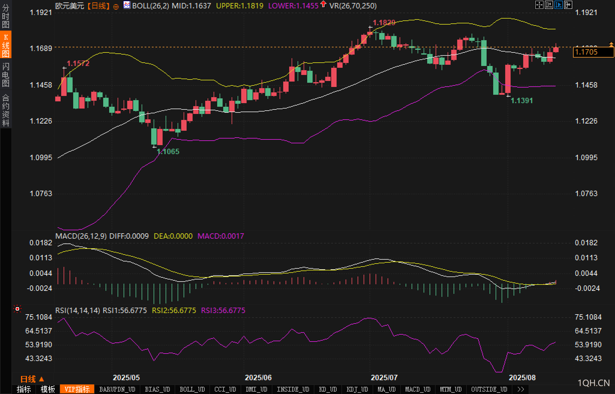 欧元/美元汇价当前稳定在1.1700附近,并且已经突破了布林带的中轨区域,显示出较强的上涨动能。从布林带来看,汇价试图靠近上轨1.1819附近。