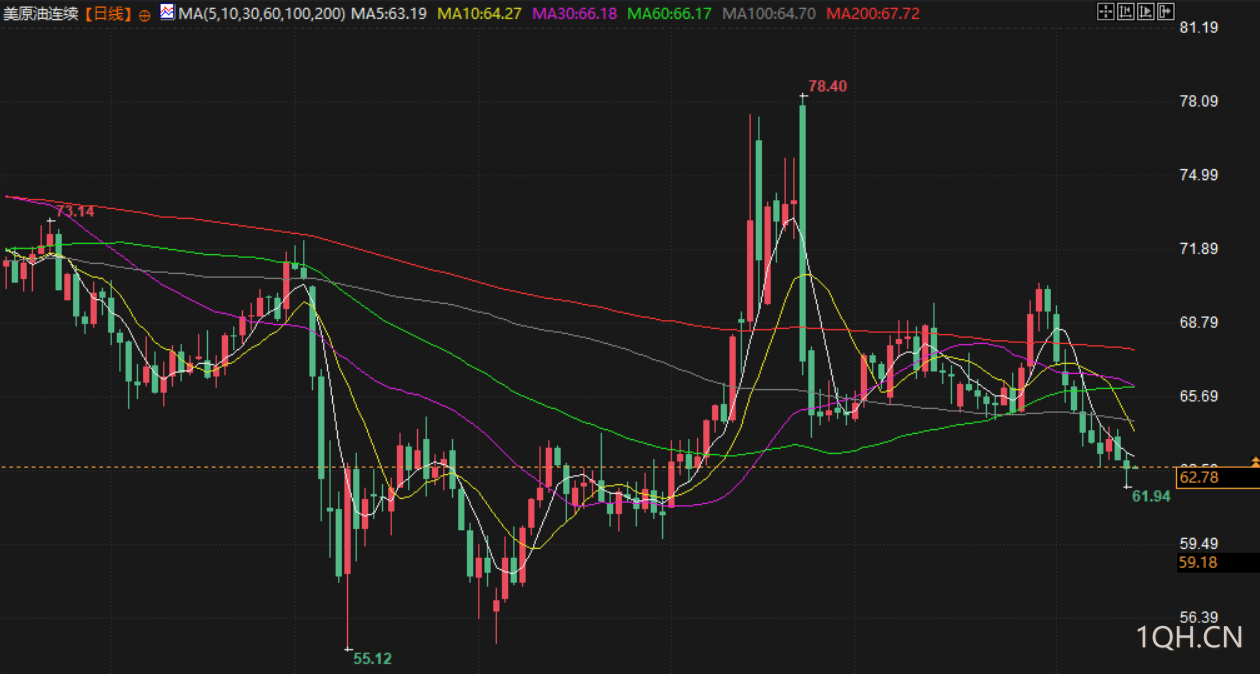布伦特原油期货结算价下跌0.7%,报每桶65.63美元。盘中一度跌至65.01美元,为6月6日以来的最低水平。美国原油期货下跌0.8%,报每桶62.65美元。该合约盘中跌至61.94美元,为6月2日以来的最低水平。