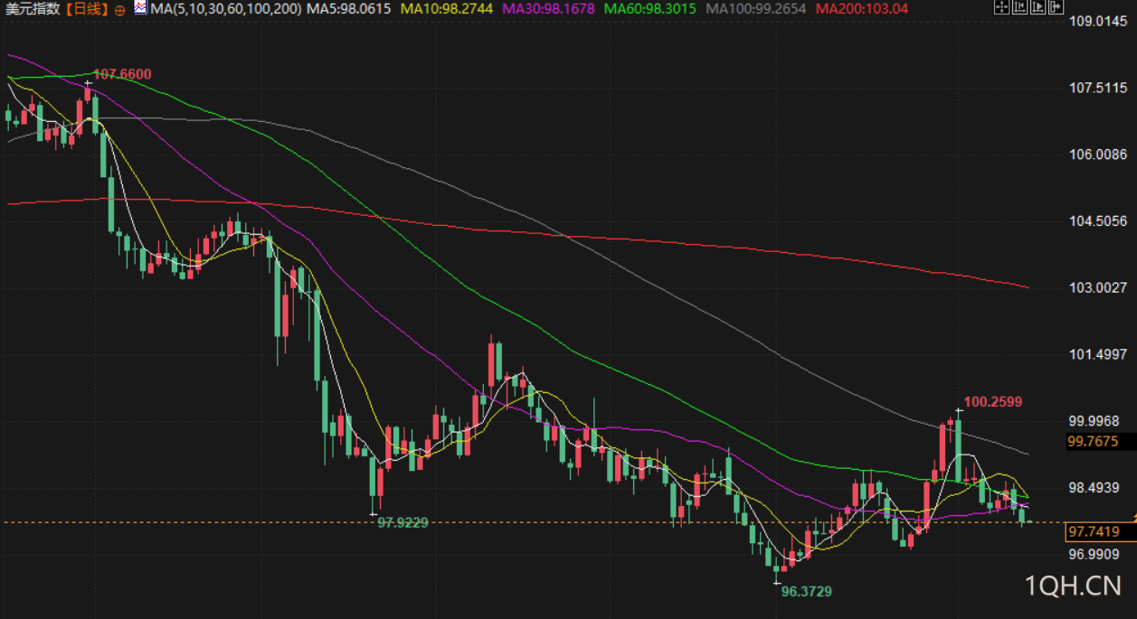 美元指数下跌 0.2%,触及 97.856的 7 月 28 日以来的最低,周二下跌0.5%。