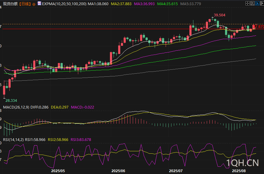 周三现货白银价格触及38.65美元/盎司,创出13个交易日新高;下一个阻力位在39.00,然后是年内的高点39.53。如果38.00跌破,下行风险在37.50和36.21处。周三,银价上涨超过1.63%,原因是美元全面走弱,交易员们已经完全消化了美联储下个月会议降息的预期。因此,与现货白银呈反向相关性的美国国债收益率随10年期基准债券下跌五个基点至4.236%。
