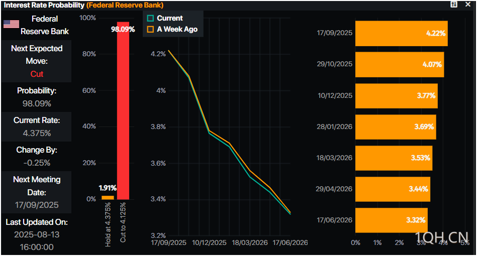 根据Prime Market Terminal数据,联邦基金利率期货显示交易员已押注9月会议降息25个基点的概率高达98%。