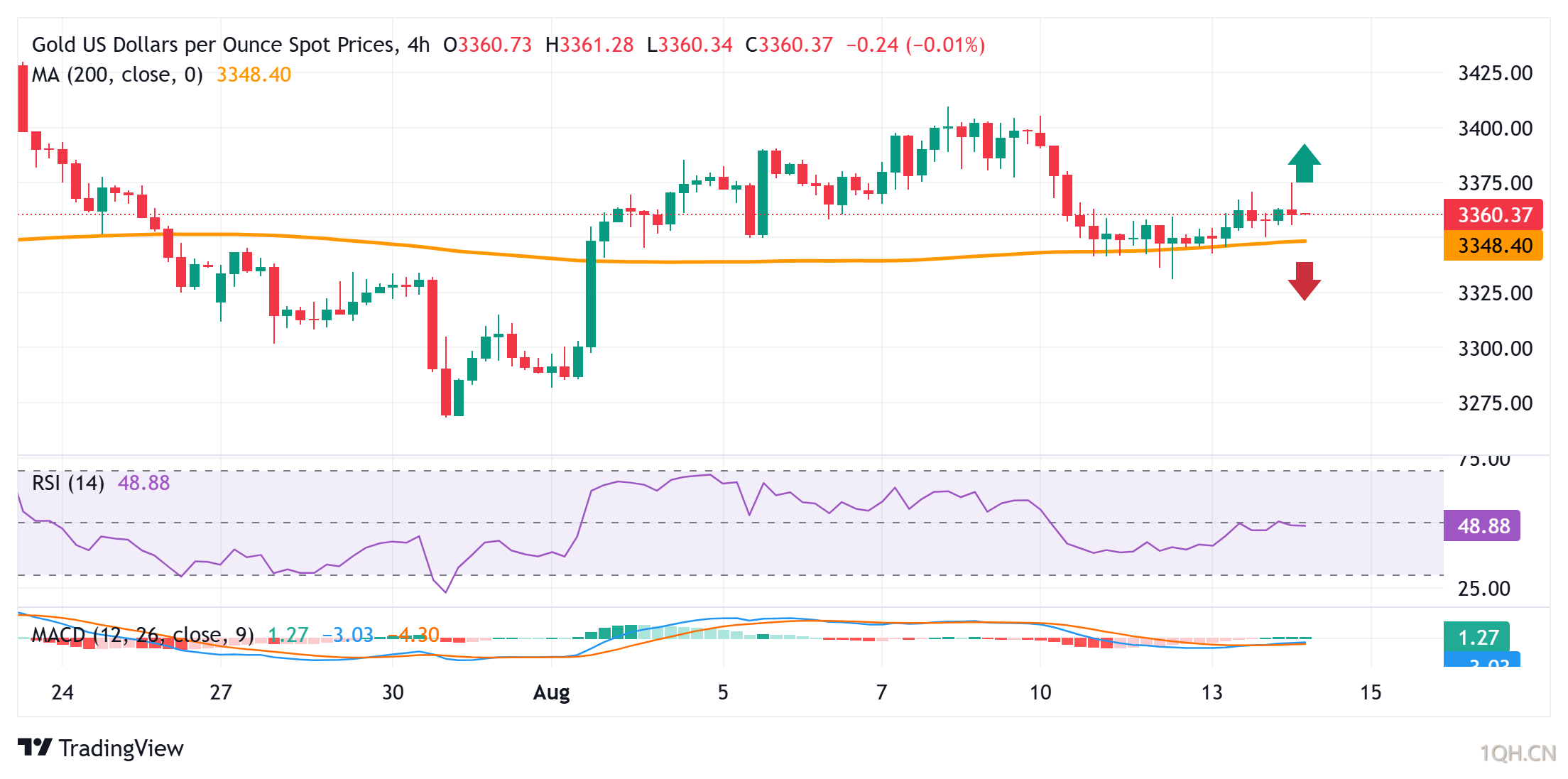 北京时间14:20,现货黄金现报3357.83美元/盎司。,