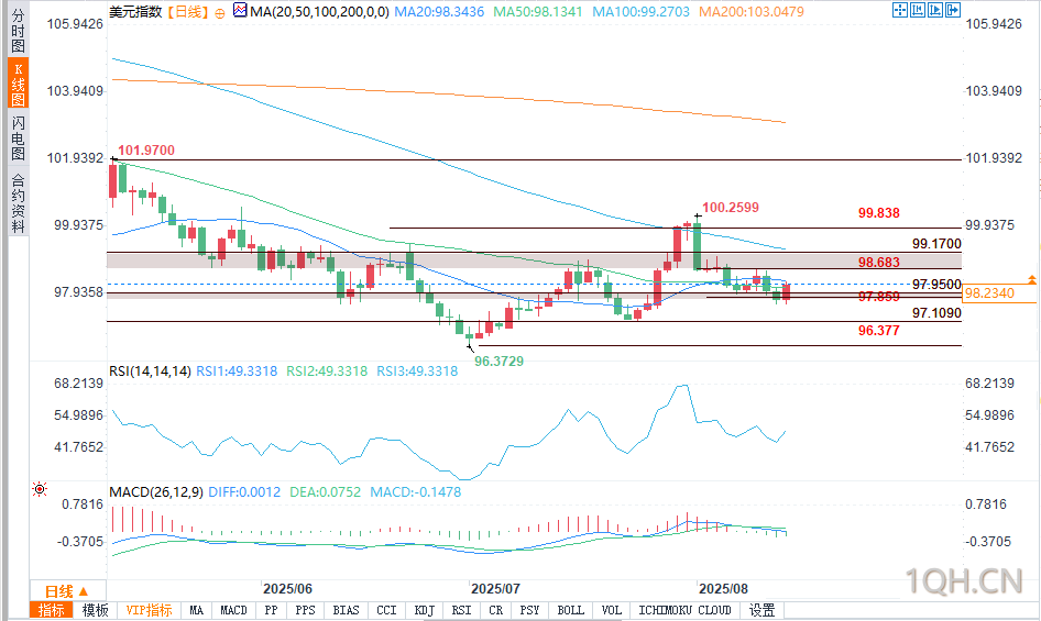 目前美元指数围绕50日平均线震荡,交易员正等待美联储杰克逊霍尔年会(8月21日-23日)给出明确方向。若鲍威尔在讲话中偏向鸽派,美元指数可能回落至98.1这一关键均线下方,并测试更低区间。