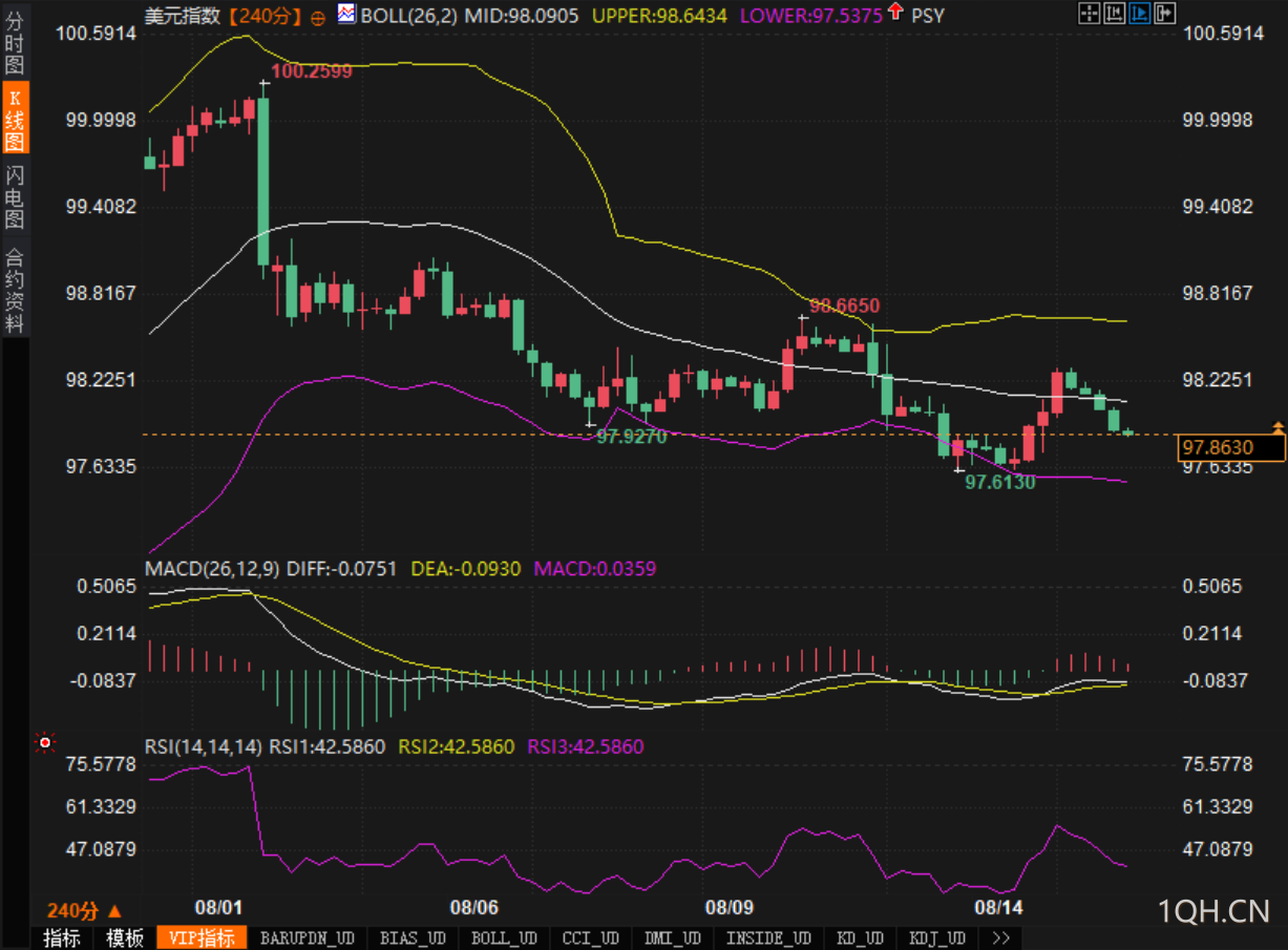 空头展望: 目前,美元依然处于下降通道内,市场对美联储9月降息的预期依旧存在,加上地缘政治风险的扰动,美元在97.60附近的支撑位能否守住,决定了空头是否能够进一步压低价格至97.00甚至更低。如果跌破97.60支撑,美元可能进入更深的回调区间。