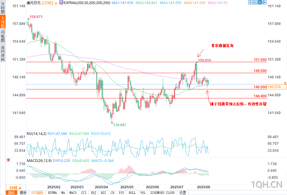 若数据推动汇率突破当前震荡区间,支撑位将分别见于146.00与144.40,阻力位则位于149.00与151.00。,