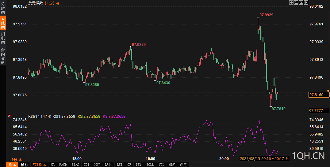 7月零售销售数据发布后,市场反应迅速但分化。美元指数(DXY)短线上扬超10点,报97.95,反映市场对消费数据符合预期的正面解读,但彭博美元即期指数随后缩减跌幅,显示市场情绪并不完全乐观。现货黄金短线走低约5美元,最低触及3333.57美元/盎司后反弹。