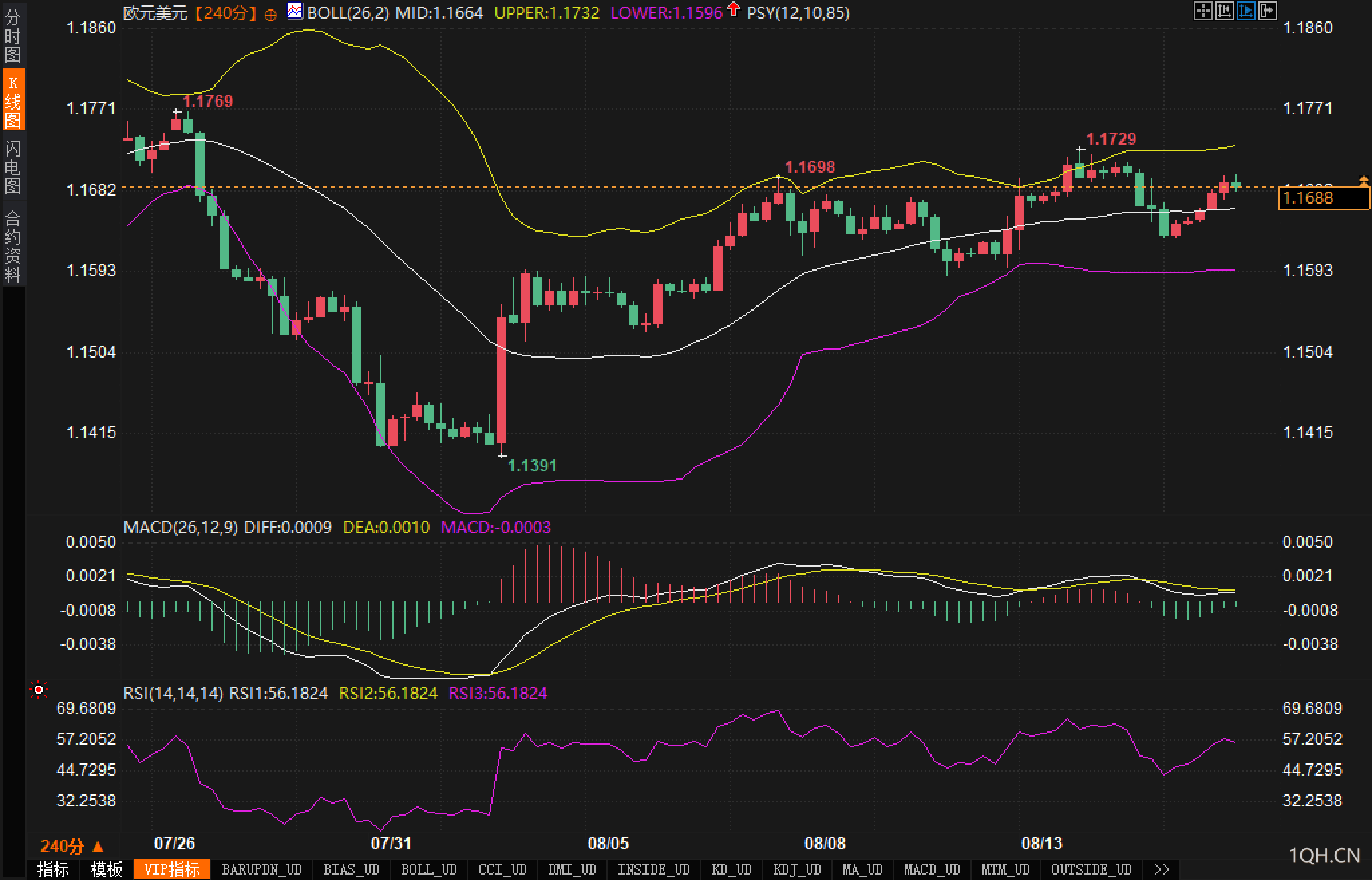 四小时K线与布林带显示,汇价自1.1391低点形成台阶式上行后,当前围绕布林中轨—上轨之间运行。指标参数显示:布林中轨在1.1664,布林上轨在1.1732,布林下轨在1.1596(下轨上移);最新价格约1.1688,位于中轨上方。布林带宽度经历前期收敛后略有张口,中轨拐头向上,提示短线升势尚未破坏,但上轨附近抛压随带宽回升而增大。价格结构上,8月先后录得1.1698与1.1729两个阶段高点,后一高点略高,构成“抬高的高点”,若放大到走势节奏,属于温和的上升通道特征;上方1.1729—1.1732(上轨)构成重叠阻力区,构成多空分水岭。