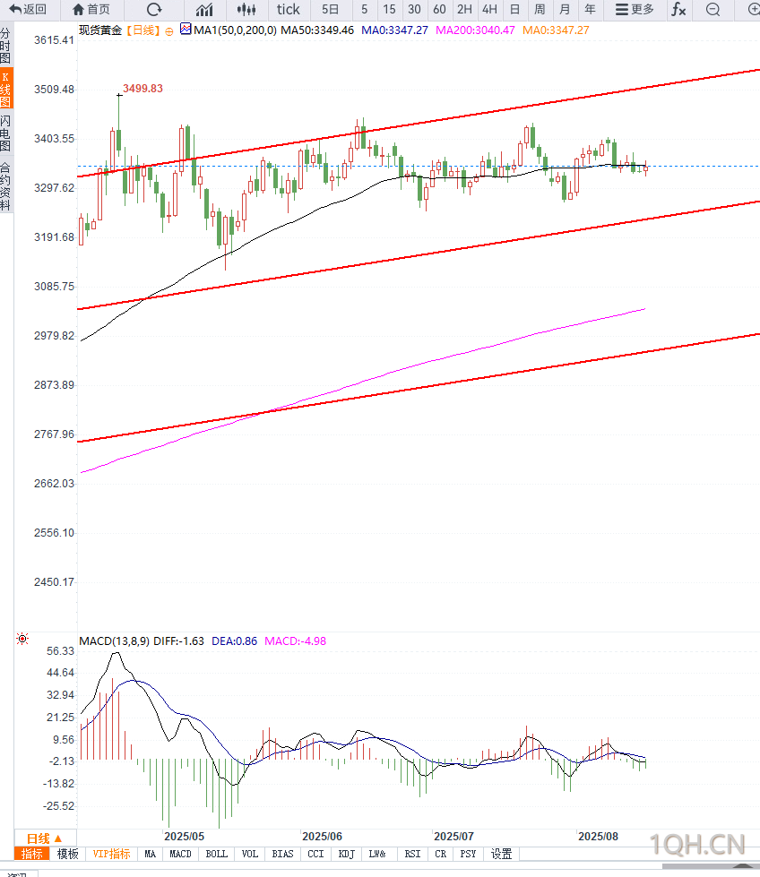然而,美元在近期数据推动下小幅走强。美国7月PPI录得2022年以来最快月度涨幅,压制了对大幅降息(50基点)的预期。此外,美国消费者信心指数意外下降,但通胀预期上升,显示物价压力仍存,这进一步削弱了黄金大幅上行的动力。
