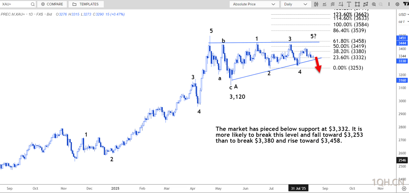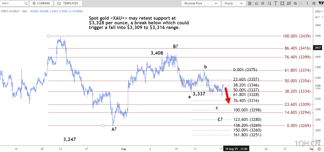 路透技术分析师指出,现货黄金可能重新测试每盎司 3328 美元的支撑位,跌破该水平可能导致金价跌至 3309 美元至 3316 美元的区间。