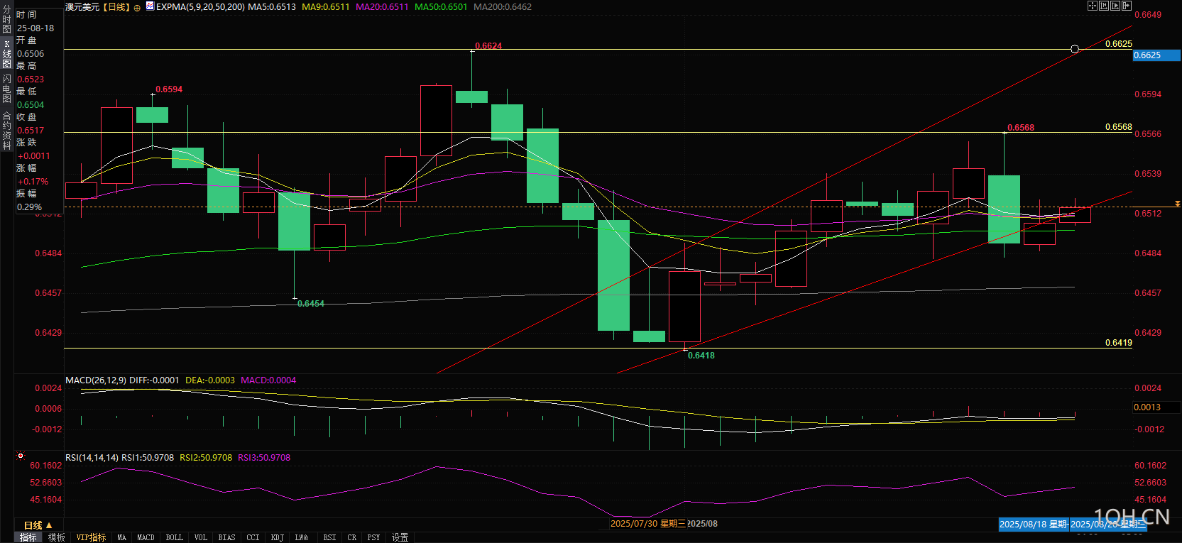下行方面,9日EMA(0.6511)构成初步支撑,50日EMA(0.6501)与心理关口0.6500形成关键支撑带。若跌破该区域,将削弱中短期价格动能,汇价或下探8月1日创下的两个月低点0.6419。