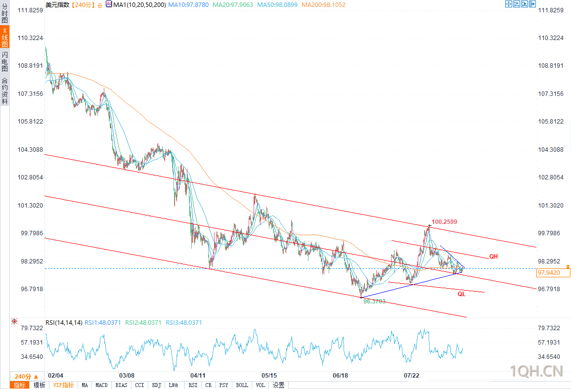 DXY将测试下降通道内的某一条“季度线”(QL/QH,即季度低点/季度高点连线)。这一情景与2025年1月以来美元整体走弱的大趋势一致。若价格突破QL线或QH线,且持续偏离通道中位线,则表明市场情绪发生转变,指数有望突破当前震荡结构,开启方向性走势。