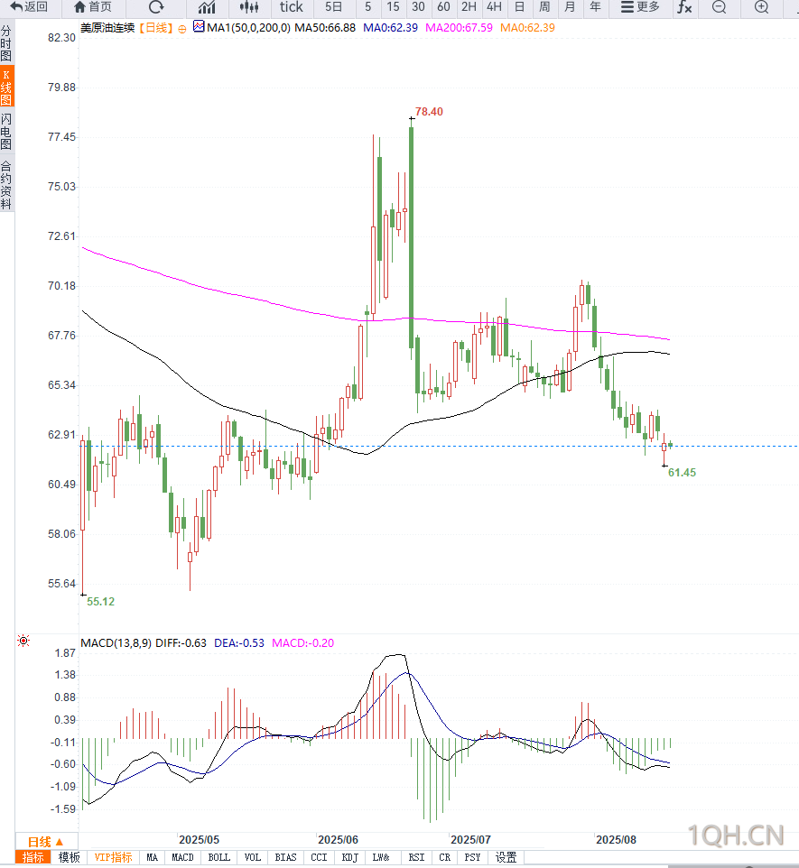 从美原油日线图形来看,价格已经跌破重要支撑,且延续震荡下行。当前支撑位集中在62美元一线,若跌破可能进一步测试60美元关口;上方阻力位在65美元附近,若突破则有望挑战68美元。