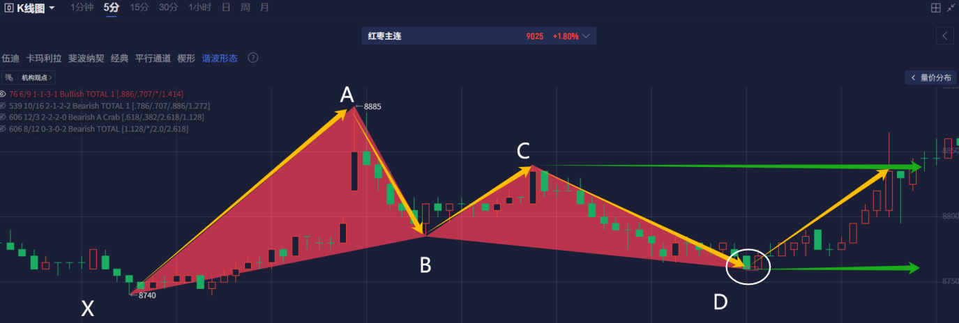 反转信号最诱人的地方在于上涨下跌空间可观,但缺点在于识别反转行情的难度较大。期货盯盘神器-谐波形态能在实时报价行情图中展示不同周期形成的谐波形态。我们一起来看看近期期货盯盘神器-谐波形态的案例。