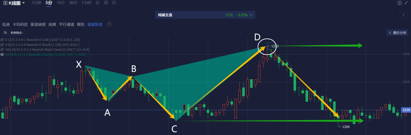 5分钟图,两个绿色三角形之间的行情为谐波形态中的熊市加特利形态,D点是潜在的反转区,形态形成后价格下跌,下跌空间为CD之间的任一位置,这波行情下跌的空间等于CD之间的距离。