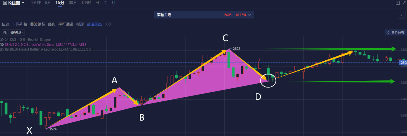 15分钟图,两个粉红色三角形之间的行情为谐波形态中的牛市白天鹅形态,D点是潜在的反转区,形态形成后价格上涨,上涨空间为CD之间的任一位置,这波行情上涨的空间等于CD之间的距离。
