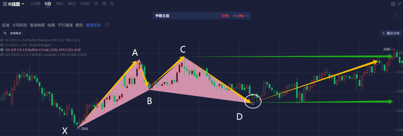 5分钟图,两个粉红色三角形之间的行情为谐波形态中的牛市螃蟹形态,D点是潜在的反转区,形态形成后价格上涨,上涨空间为CD之间的任一位置,这波行情上涨的空间等于CD之间的距离。